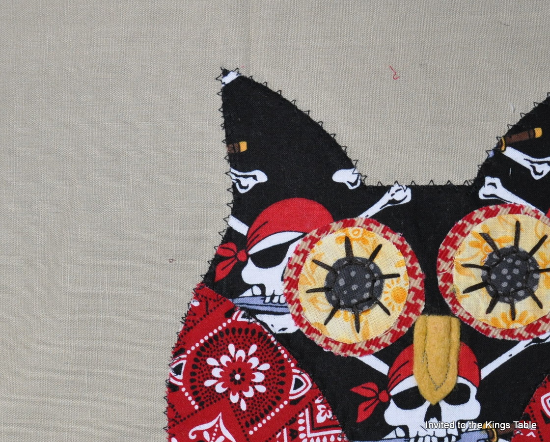Pirate Owl. I am not finished with this one just yet. I am thinking about adding some type of nautical stuff on the pillow back ground before I sew it all together. I am not crazy about the pirate fabric as the background - I think the placement of the print is not perfect, but doable I suppose. This will soon be up in my Etsy shop!